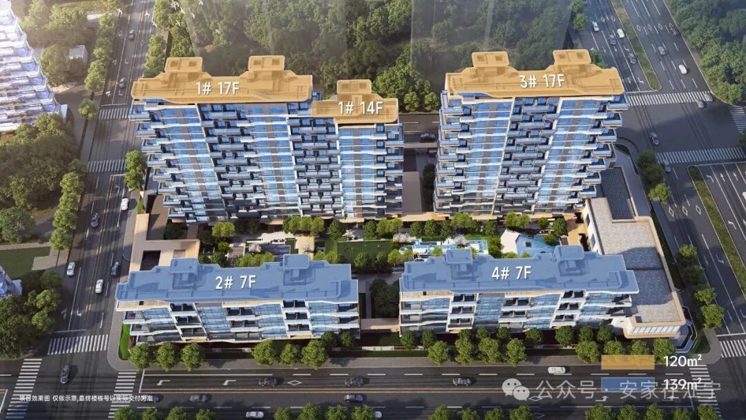 项目规划4栋7-17F低密住所,其间2栋洋房,户型建面约139㎡;2栋小高层,户型建面约120㎡,总共202套,户户得房率超100%。