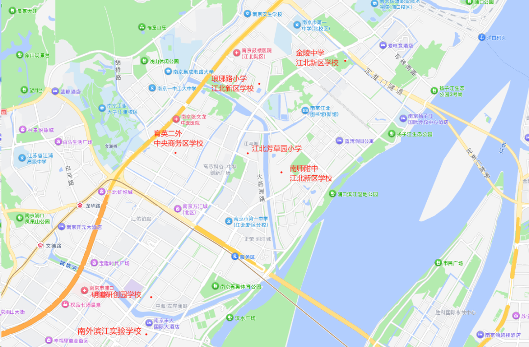 南师附中江北新区校园坐落江北核心区核中核片区,西至七里河、北至九袱洲路。校园周边有扬子江金茂悦、绿洲海悦、大华云江印月、中交锦方等已交给小区。