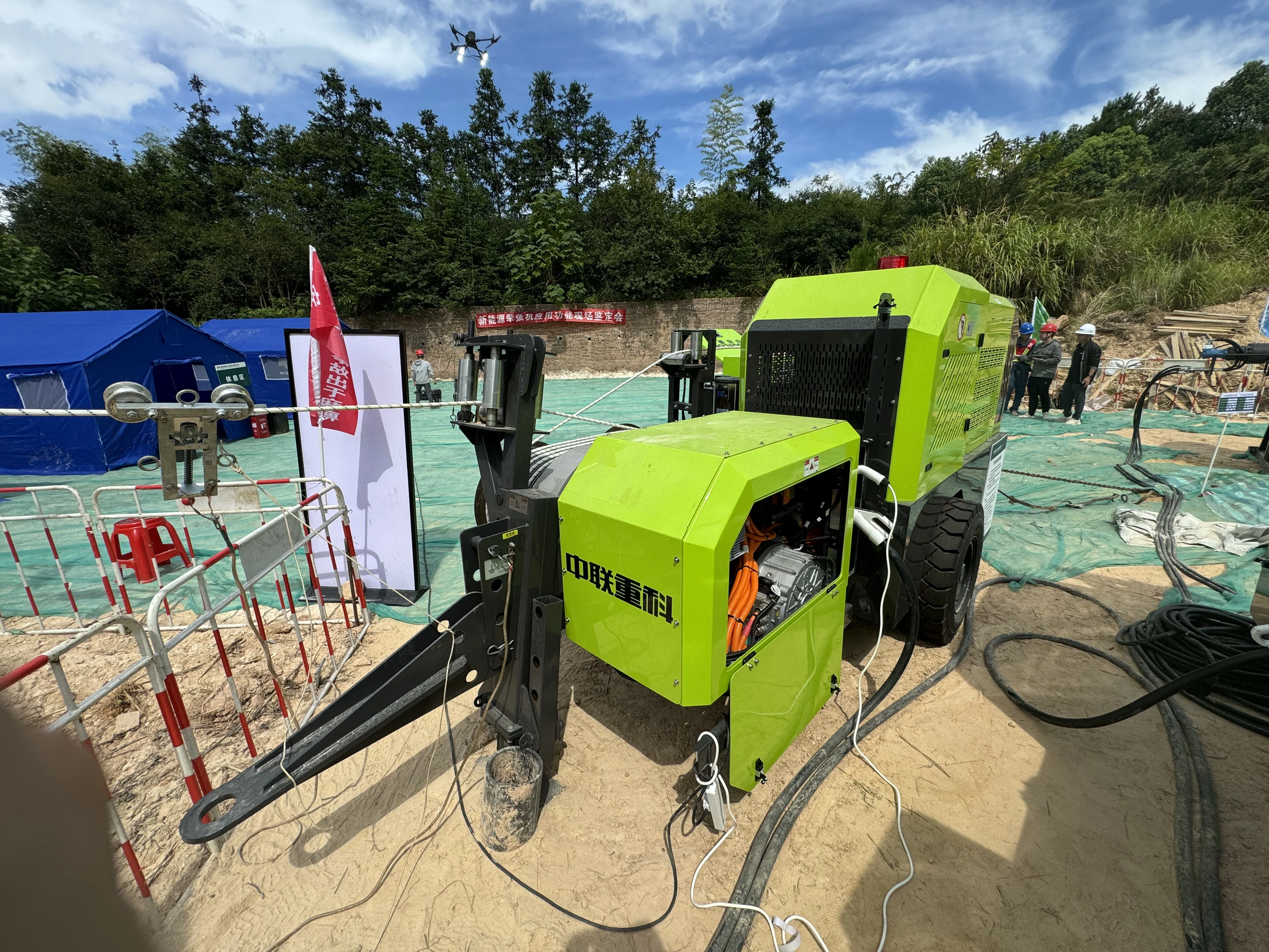 在现场,中联重科应急装备公司打造的新能源牵张设备彻底改变了传统燃油动力模式,以电驱系统全面替代燃油驱动,实现施工全套工艺流程零排放、零污染,在节能、降噪、高效及智能方面表现卓越。新能源张力机可高效回收牵引动能,不仅实现电池能量自给自足,还可将富余电能用于设备间共享或外放电,支持为系留无人机系统供电,实现夜间照明等应用。新能源牵引机采用“电驱+增程”方案,电量不充足时增程器自动启动,保障持续作业,相较于传统燃油牵引机,节能率达50%以上。